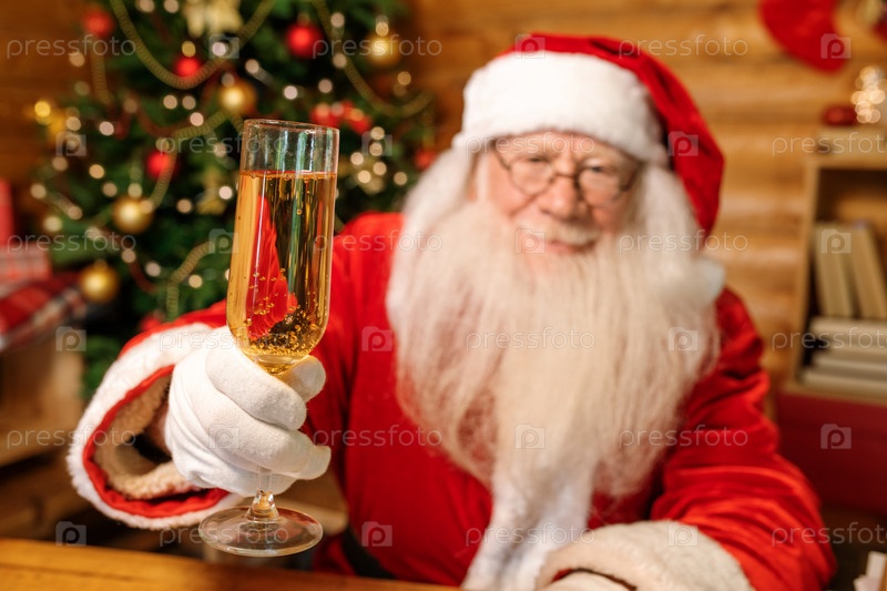Счастливого Санта-Клауса, который радуется флейтой шампанского перед камерой