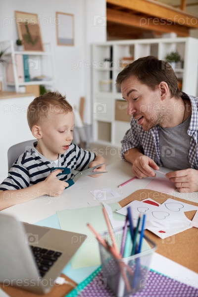 Молодой отец и милый сын сидят за столом в гостиной, делая карту Валентина из бумаги для матери