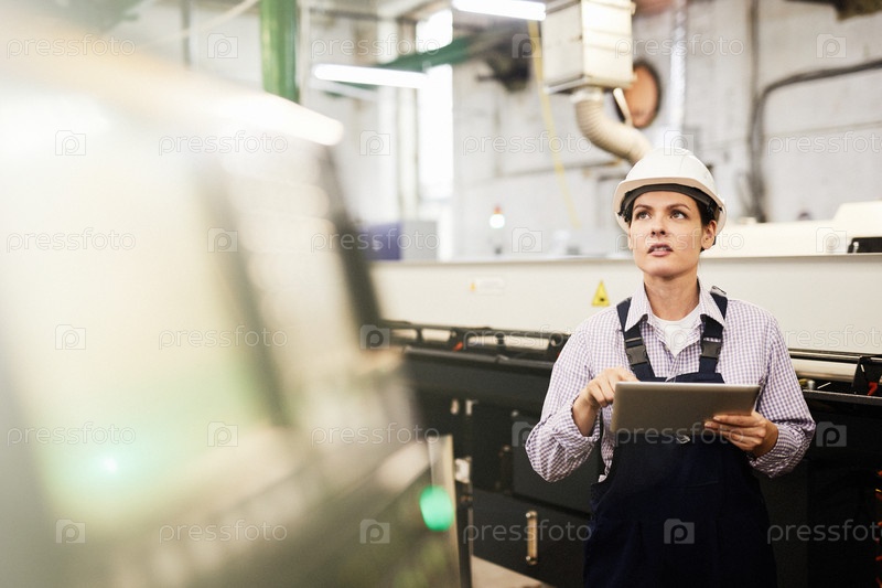 Интроспективная опытная молодая женщина в hardhat, стоящая на фабрике и использующая цифровой планшет во время анализа процессов станкового токарного станка