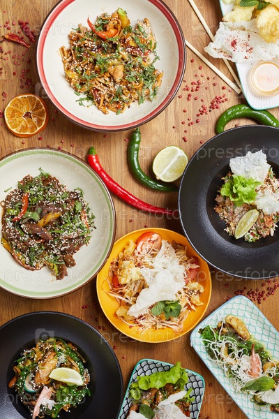 Ассортимент азиатских блюд на заднем плане