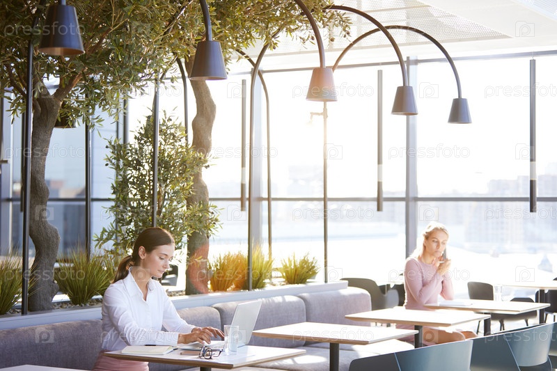 Серьезная молодая привлекательная бизнес-леди с конским хвостом сидит за столом в кафе с Wi-Fi и печатает на ноутбуке