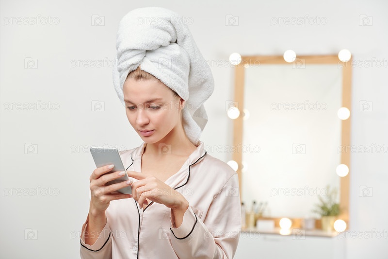 Молодая чистая женщина в шелковой пижаме прокручивает сообщения на смартфоне