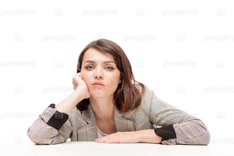 Молодая задумчивая или усталая студентка, сидящая у стола на уроке
