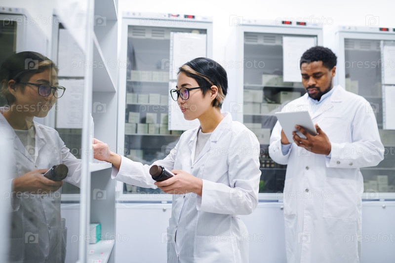 Азиатский фармацевт сортирует лекарства в хранилище