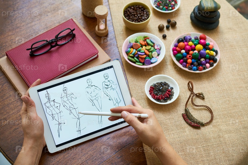 Дизайнер рисует эскизы на планшетном компьютере