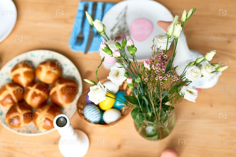 Высокоугольный вид красивых диких цветов в вазе, размещенной на пасхальном столе