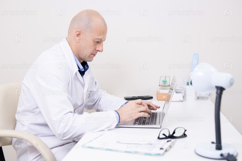 Серьезный доктор средних лет в белом халате, концентрирующийся на работе с ноутбуком