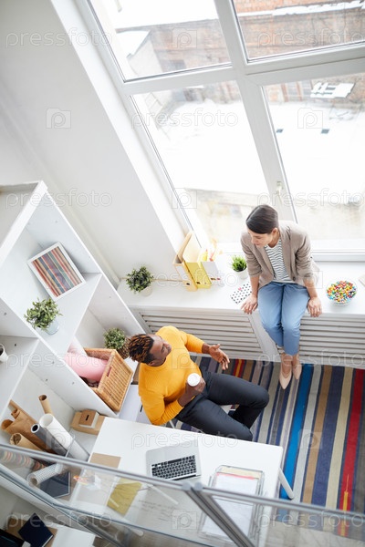 Высокоугольный вид позитивных молодых мультиэтнических коллег в непринужденной одежде, пьющих кофе и разговаривающих в современном офисе