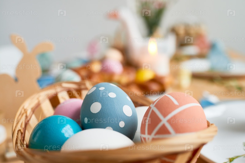Необычный дизайн пасхальных яиц: крупный план окрашенных яиц с точками и полосами в плетеновой корзине на обеденном столе