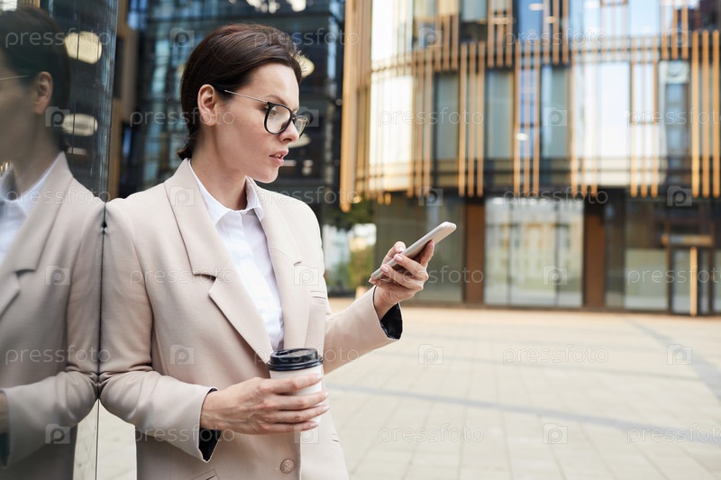 Вдумчивая современная бизнесвумен средних лет в очках, опираясь на стену здания и используя смартфон во время общения с деловым партнером онлайн