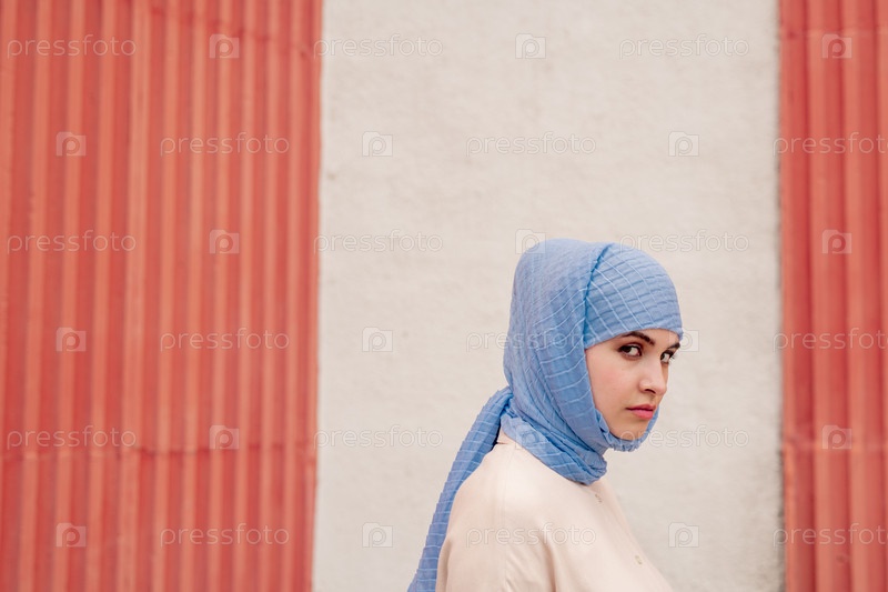 Молодая мусульманка в синем хиджабе стоит у стены здания