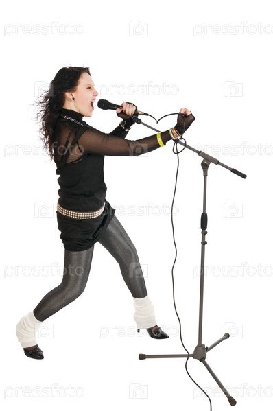 Страстная певица с микрофоном на белом фоне