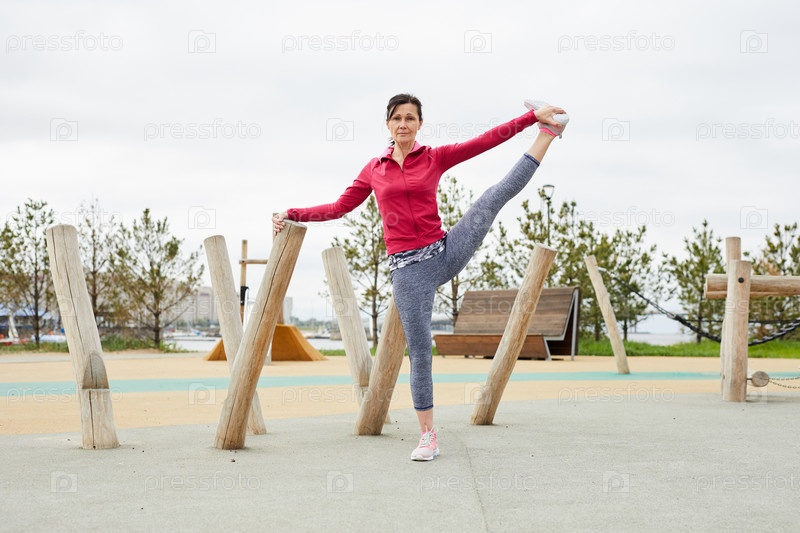Зрелая женщина растягивается на открытом воздухе