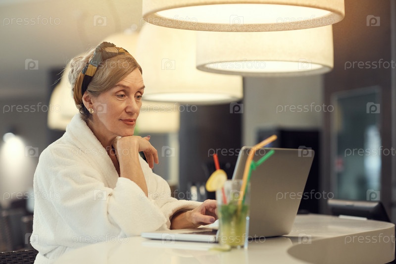 Элегантная пожилая женщина, использующая ноутбук в SPA Resort