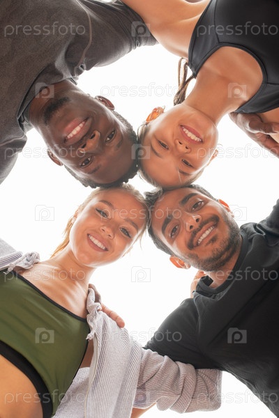 Низкий угол четырех молодых межкультурных спортсменов в спортивной одежде, смотрящих на вас