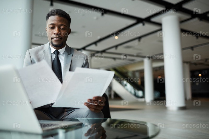 Умный чернокожий бизнесмен с документами и ноутбуком