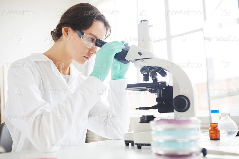 Студент медицинской школы с помощью микроскопа