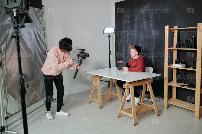 Молодой оператор в повседневной одежде держит камеру перед блогером с черным ящиком