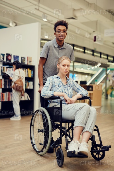Портрет улыбающегося молодого чернокожего студента в очках, толкающего инвалидное кресло с девушкой, помогая ей в университетской библиотеке