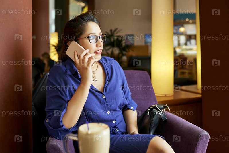 Женщина, разговаривающая по мобильному телефону в кафе