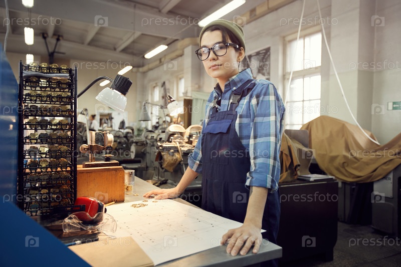 Портрет серьезной женщины-работницы производства в хипстерской шляпе, стоящей за столом и собирающей механизм наручных часов согласно схеме