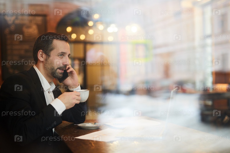 Улыбающийся зрелый бизнесмен, работающий в кафе
