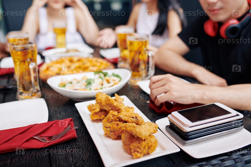 Ужинный стол с едой и мобильными телефонами
