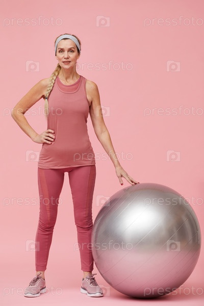 Спортивная зрелая женщина позирует против розовой