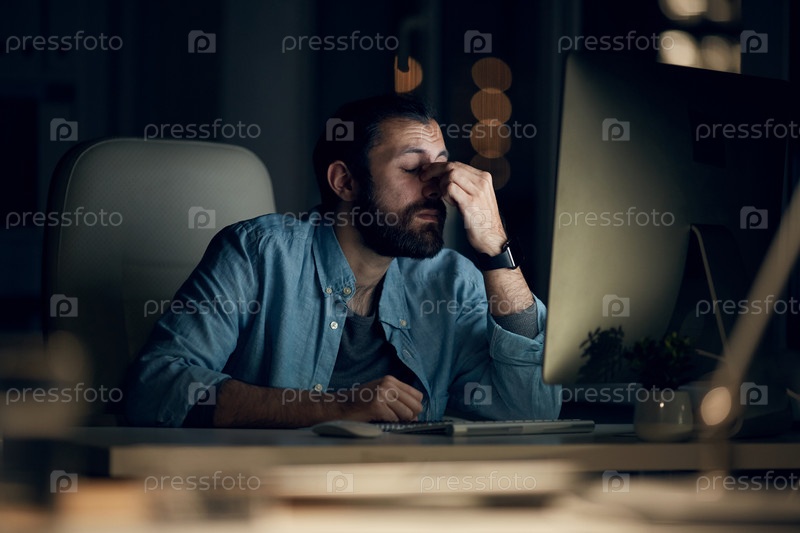 Усталый молодой хипстер-компьютерный программист в обычной рубашке сидит за столом и протирает носовой мост, работая допоздна в офисе