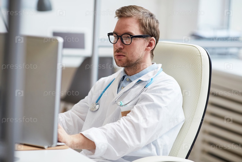 Серьезный занятый молодой врач в очках сидит за столом и пользуется компьютером, читая онлайн медицинские записи в собственном кабинете