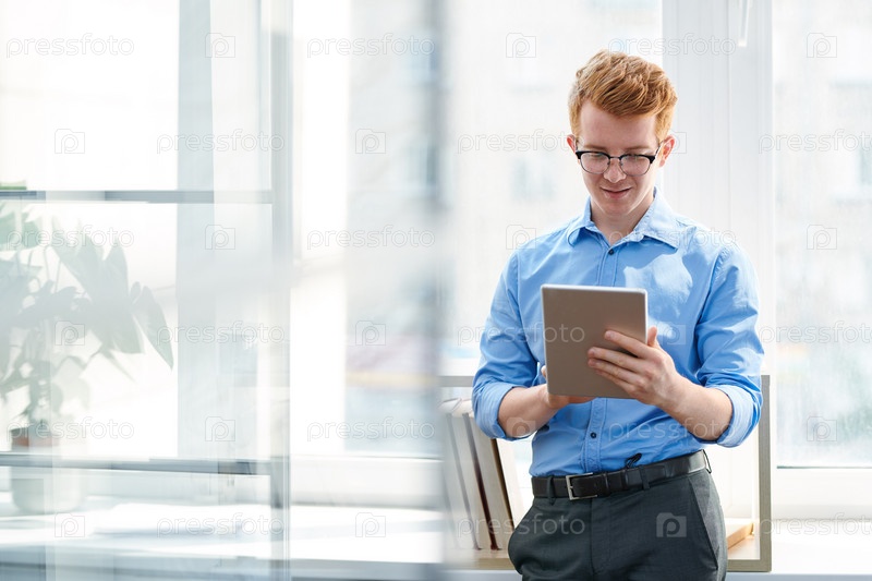 Молодой человек в формальной одежде прокручивает планшет