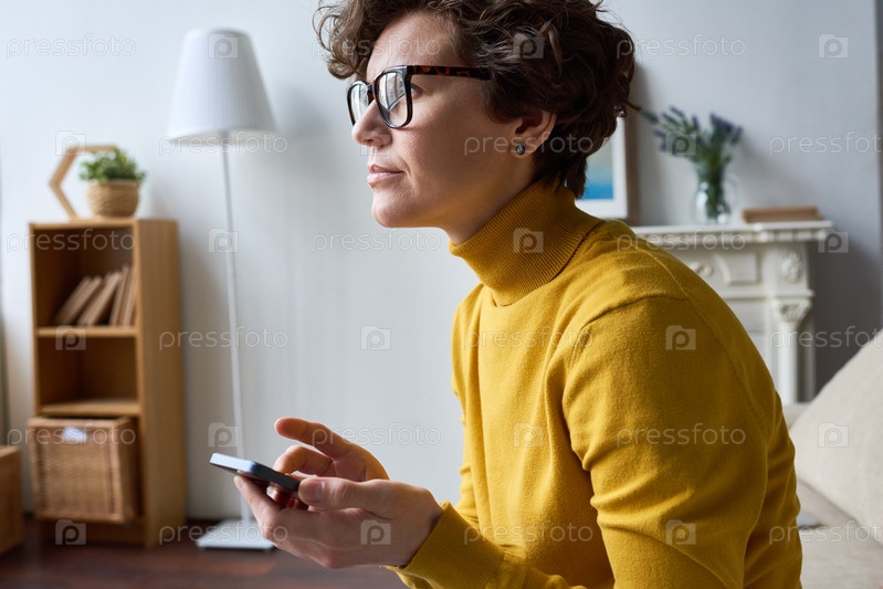 Вдумчивая женщина, отправляющая смс-сообщения дома