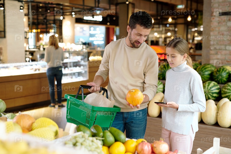 Молодой отец с корзиной консультирует дочь, в то время как оба выбирают спелую дыню