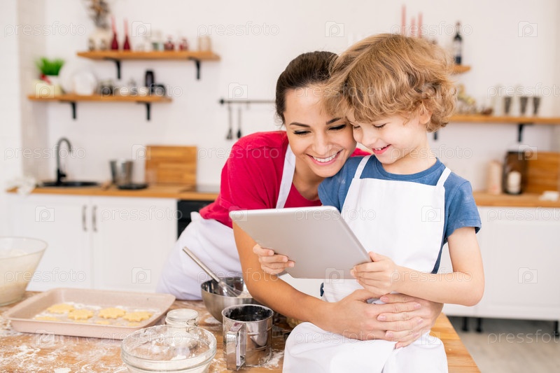 Милый мальчик с сенсорной панелью и его счастливая мама обсуждают видеорецепт