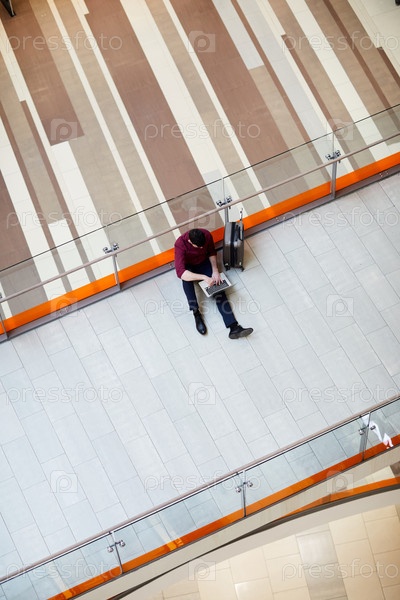 Прямо над нами виден занятый молодой человек, сидящий на полу в лобби аэропорта и печатающий на ноутбуке во время удаленной работы
