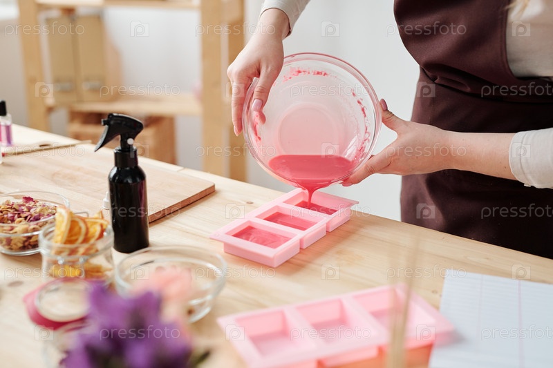 Креативная женщина наливает розовую жидкую массу мыла из миски в силиконовые формы