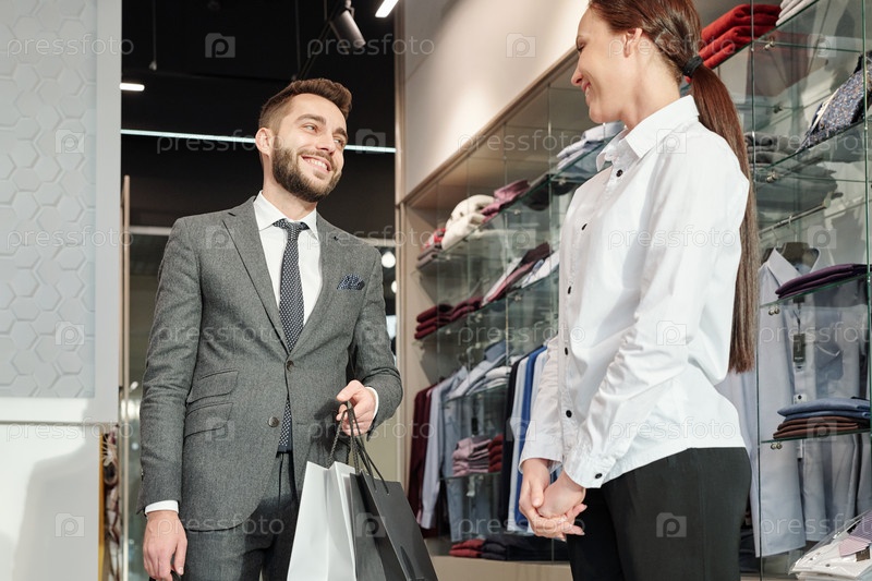 Молодой веселый бизнесмен с бумажными пакетами, который благодарит продавца