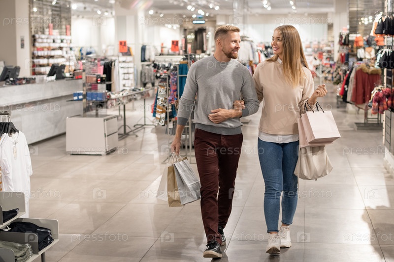 Молодые покупатели с бумажными пакетами покидают отдел случайной одежды в торговом центре