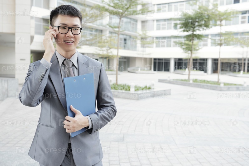 Бизнесмен разговаривает на мобильном телефоне снаружи