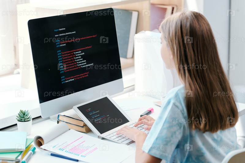 Красивая школьница с длинными коричневыми волосами, сидящая перед монитором компьютера