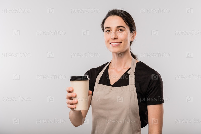 Счастливая брюнетка-официантка в фартуке предлагает вам бокал кофе или молочный коктейль