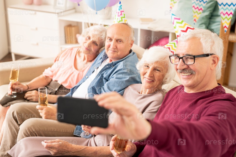 Группа веселых старшеклассников, делающих селфи на диване