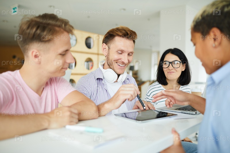 Студенты обсуждают университетский проект в библиотеке