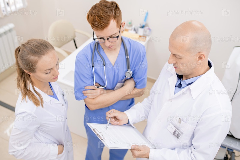 лысый серьезный врач, указывающий на документ во время чтения его вслух молодым интернам