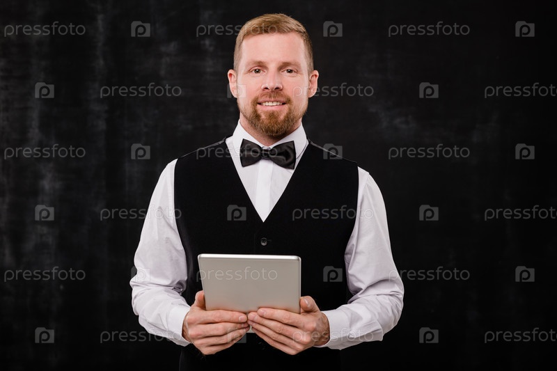 Счастливый молодой официант в галстуке и черном жилете, держащий цифровой планшет