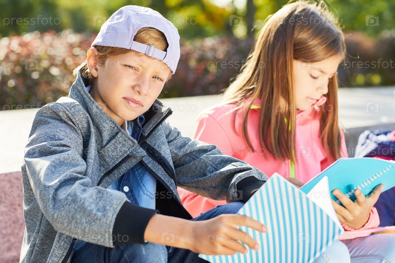 Школьник с учебником на улице