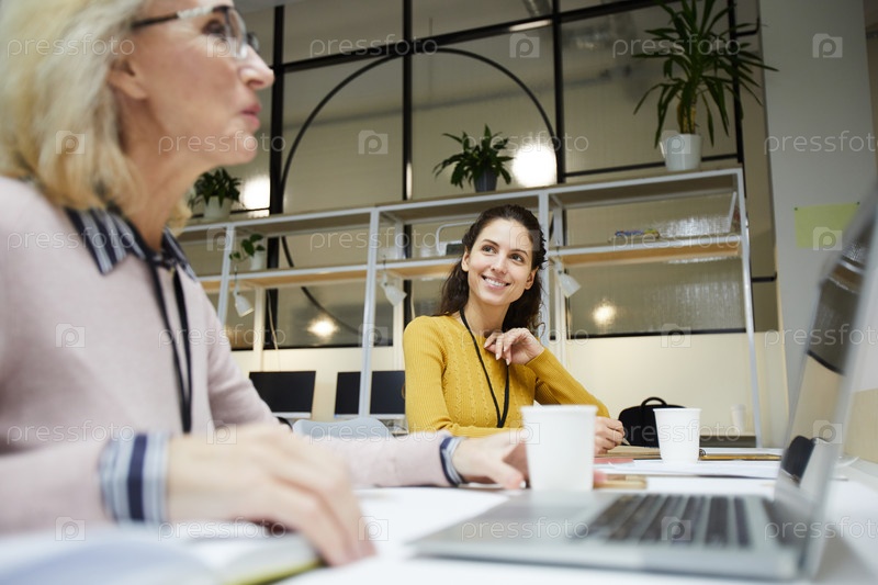 Улыбающиеся дамы разговаривают в офисе