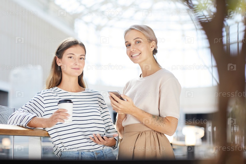 Портрет счастливых красивых молодых подруг-женщин в повседневных нарядах, стоящих в современном фойе и использующих гаджеты