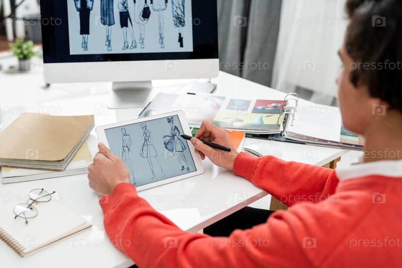 Молодой креативный дизайнер моды с планшетом прокручивает новые модели