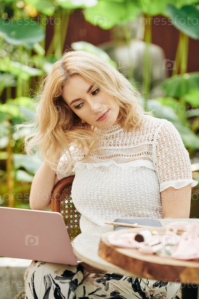 Молодая женщина читает новости онлайн